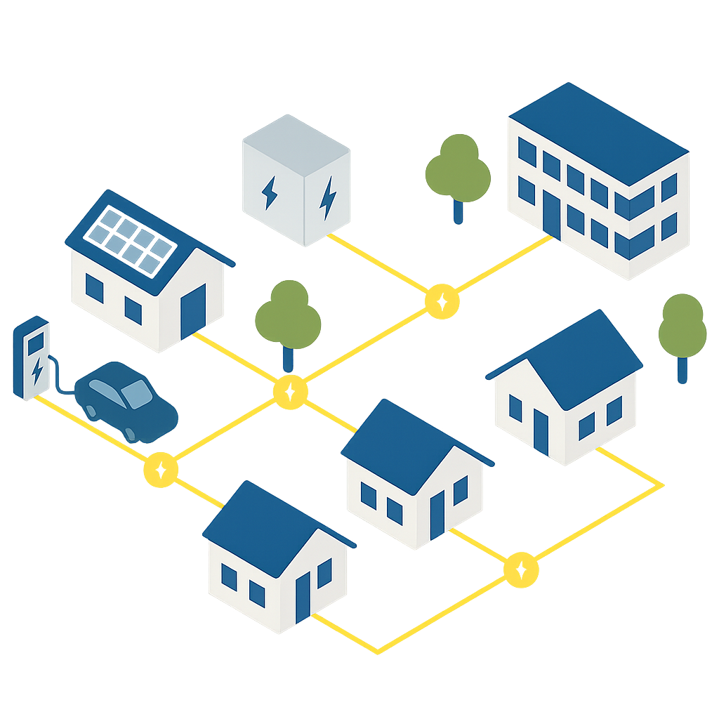 Eine Energiegemeinschaft ist ein lokales Netzwerk, in dem Haushalte, Unternehmen und öffentliche Einrichtungen gemeinsam erneuerbaren Strom erzeugen, nutzen und optimieren.